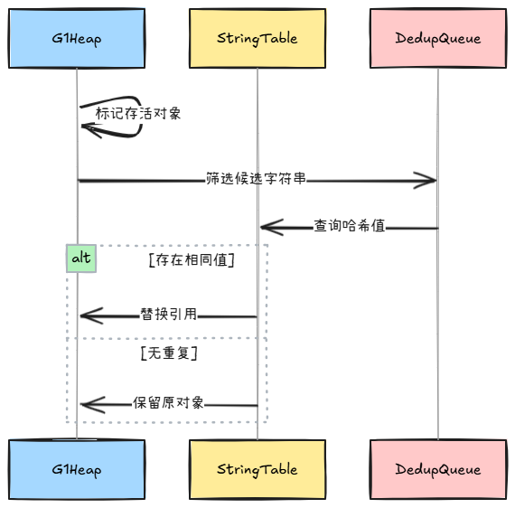 - 标记阶段:识别重复候选(连续多次Young GC存活)