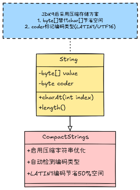 存储(每个字符2字节) - JDK9+引入Compact Strings: