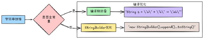 - 常变量混合拼接:至少产生3个对象(StringBuilder、拼接结果、可能的临时对象)
