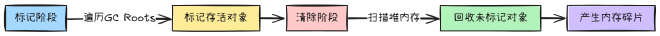- 清除阶段:线性遍历堆内存,回收未被标记的对象块