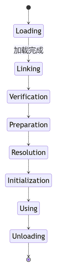 Java虚拟机的类加载机制是Java生态体系的基石,理解类的生命周期对诊断内存泄漏、性能调优和解决类加载冲突至关重要。如图1所示,类的完整生命周期包括加载、链接、初始化、使用和卸载五个阶段,其中链接阶段又细分为验证、准备、解析三个子阶段: