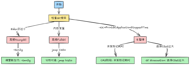 晋升失败 | “Promotion Failed"日志出现 | Survivor空间不足或年龄阈值低 |