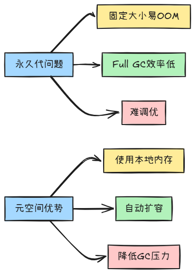 - 内存管理:元空间使用本地内存,避免堆内存大小限制