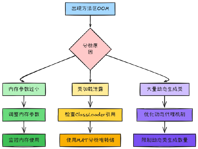 Metaspace OOM | jcmd GC.class_stats | 1. 调整MaxMetaspaceSize 2. 检查动态代理类生成 |
