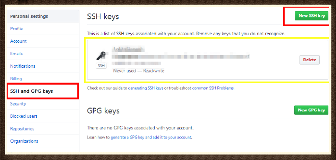 (黄色框框是我已经建立的SSH key。) 点击右上角新建一个SSH Key。