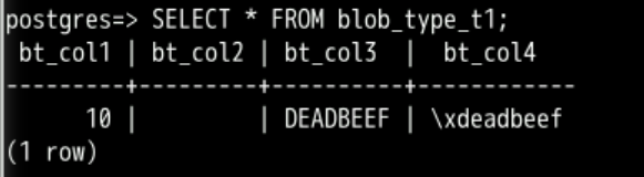 INSERT INTO blob_type_t1 VALUES(10,empty_blob(), HEXTORAW('DEADBEEF'), E'\\xDEADBEEF');