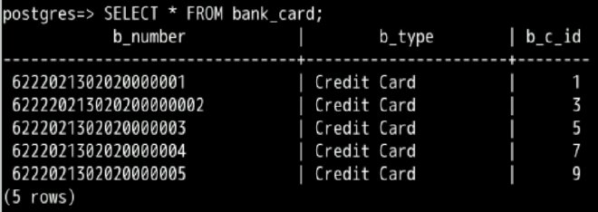 INSERT INTO bank_card(b_number, b_type, b_c_id) VALUES ('622220213020200000002','Credit Card', 3);