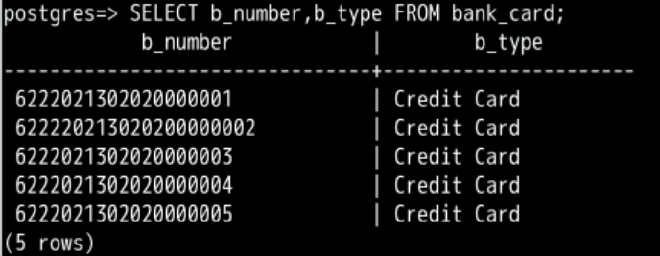 (2) 查看bank_card表中的银行卡号和卡类型