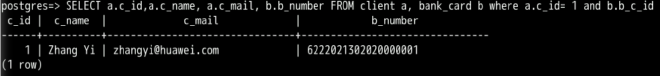 (3) 查看客户为1的客户编号,客户名称,客户邮箱和银行卡号信息