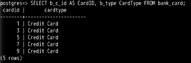 SELECT b_c_id AS CardID, b_type CardType FROM bank_card;