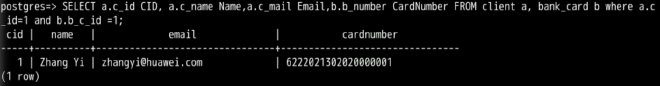 INSERT INTO client(c_id, c_name, c_mail, c_id_card, c_phone, c_password) VALUES(1,'Zhang Yi','zhangyi@huawei.com', '340211199301010001', '18815650001','gaussdb_001');