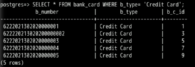 INSERT INTO bank_card(b_number, b_type, b_c_id) VALUES ('6222021302020000001','Credit Card', 1);