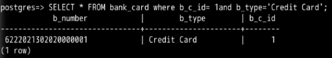 SELECT * FROM bank_card where b_c_id= 1and b_type='Credit Card';