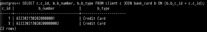 SELECT c.c_id, b.b_number, b.b_type FROM client c JOIN bank_card b ON (b.b_c_id = c.c_id);