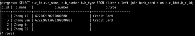 SELECT c.c_id,c.c_name, b.b_number,b.b_type FROM client c left join bank_card b on c.c_id=b.b_c_id;