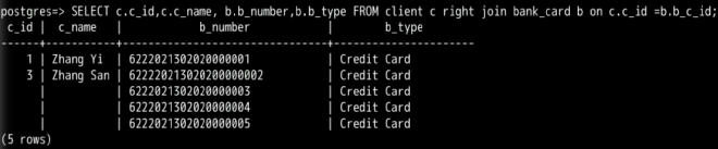 SELECT c.c_id,c.c_name, b.b_number,b.b_type FROM client c right join bank_card b on c.c_id =b.b_c_id;