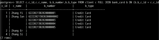 通过全连接获取表client和表bank_card的完全连接数据