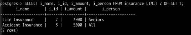 SELECT i_name, i_id, i_amount, i_person FROM insurance LIMIT 2 OFFSET 1;
