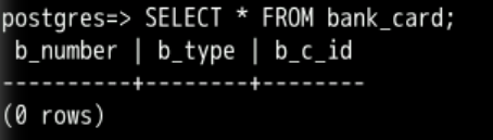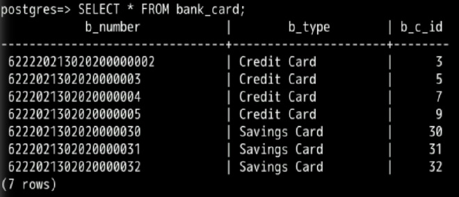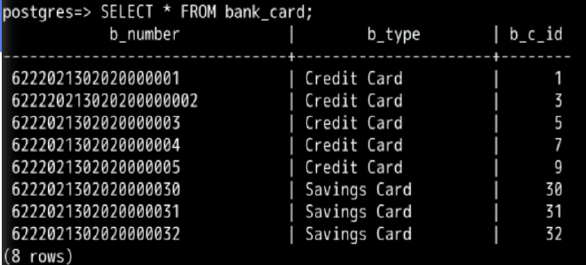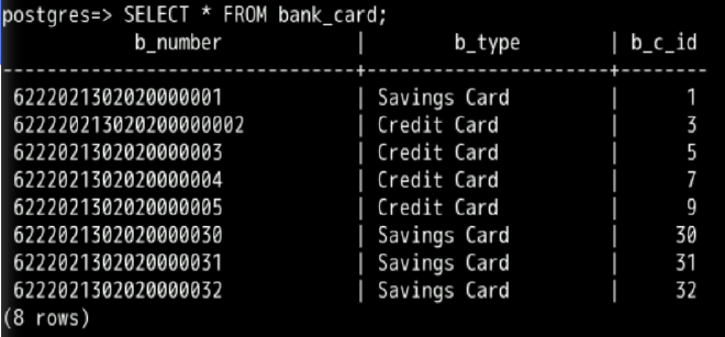 SELECT * FROM bank_card;