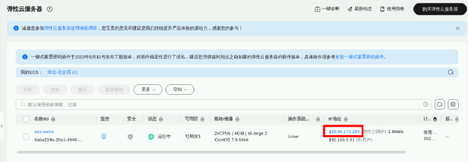 注意:IP地址可进入华为云ECS服务查看: