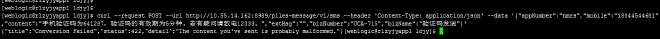 curl --request POST --url http://10.55.14.162:8989/piles-message/v1/sms --header 'Content-Type: application/json' --data '{"appNumber":"nmrs","mobile":"18844544681","content":"手机验证码为641287,验证码的有效期为5分钟。若有疑问请致电12333。","extMsg":"","bizNumber":"UCA-715","bizName":"验证码发送"}'