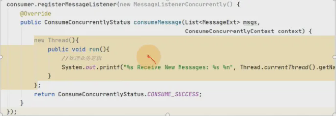 但是有一种情况可能会存在消息丢失,比如以下代码:接收消息时会开一个线程去接收消息,主线程直接返回接收成功,相当于一个异步的操作,这样会提高吞吐量,但是会有消息丢失的风险。