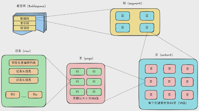 页是InnoDB中最小的逻辑存储单元,默认大小为16KB(可通过配置调整)。页是数据读写的基本单位,所有数据操作都是基于页的。