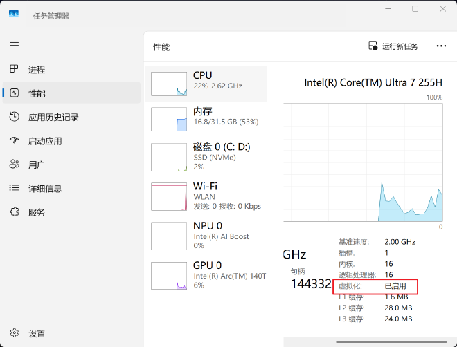 在右下角查看 “虚拟化” (Virtualization):