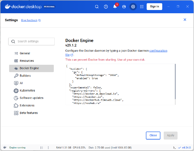 { "builder": { "gc": { "defaultKeepStorage": "20GB", "enabled": true } }, "experimental": false, "registry-mirrors": [ "https://docker.m.daocloud.io", "https://huecker.io", "https://dockerhub.timeweb.cloud", "https://noohub.ru" ] }(注:国内镜像源经常变动,如果上述源失效,可搜索“2025 Docker 国内镜像源”替换)